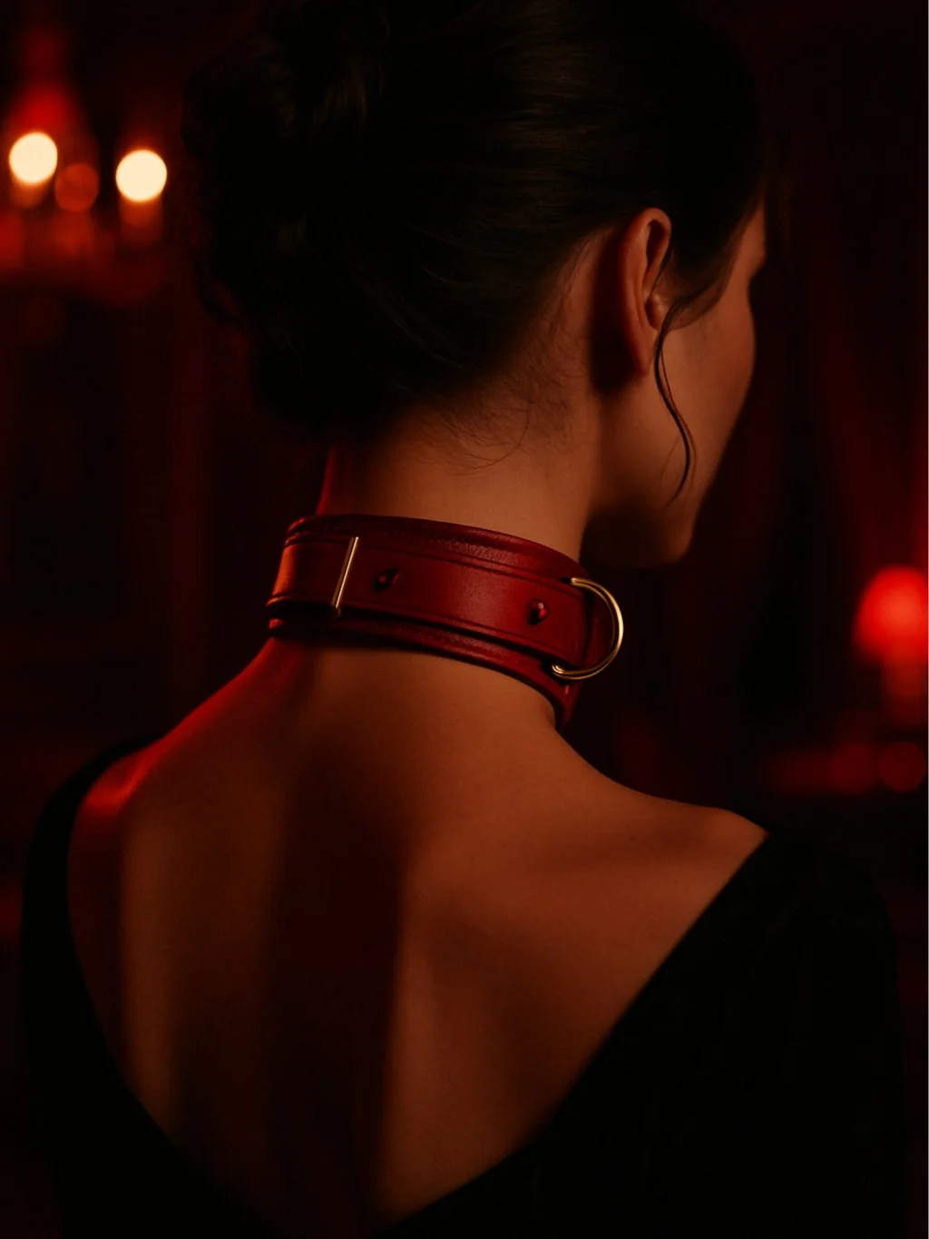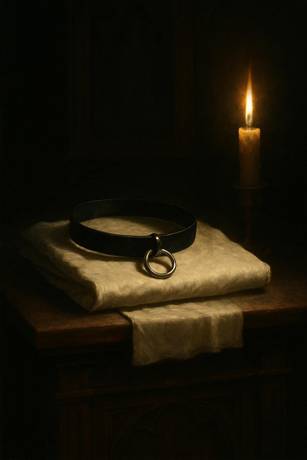 Collier noir, simple, mais resserré. Poignets entravés dès l’entrée. Bouche rincée, lubrifiée à l’huile parfumée. Yeux bandés. On ne lui expliqua rien, elle n’avait rien demandé, elle n’avait pas le droit de parler.