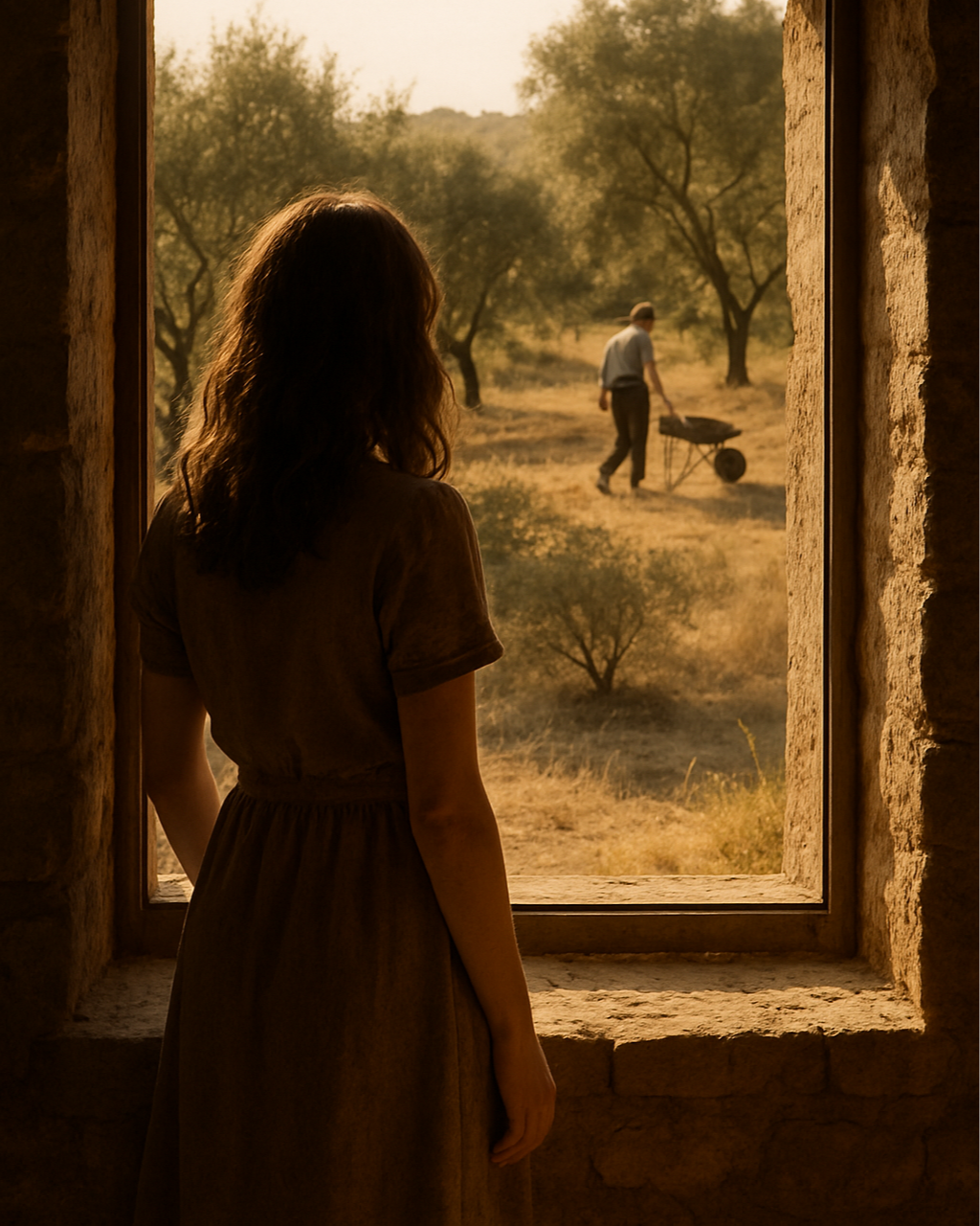 Le lendemain matin, elle le vit pour la première fois. Depuis la fenêtre de la cuisine, en train de verser de l’eau chaude dans un bol, elle aperçut une silhouette qui avançait entre les oliviers. Grand, solide, le torse nu sous sa salopette, les bras brunis par le soleil. Il poussait une brouette pleine de bois, les pas lourds, réguliers.